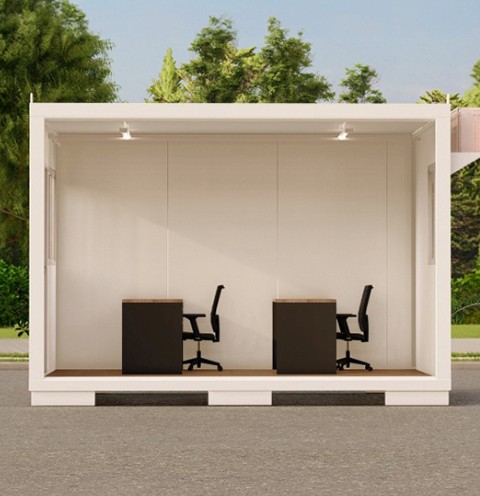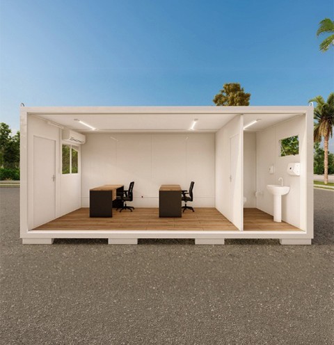 Espaço compacto e funcional com banheiro integrado, conforto térmico, estrutura resistente e layout ideal para uso administrativo diário.