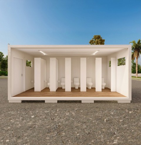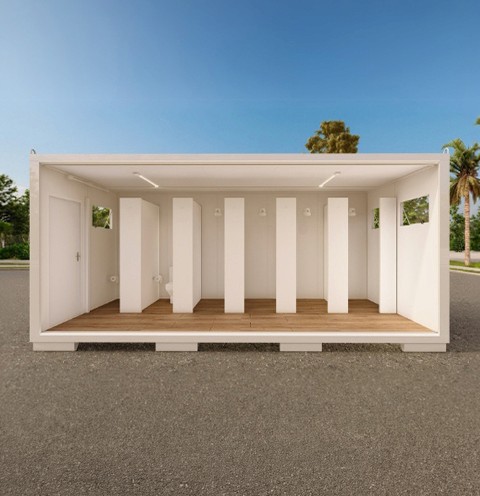 Solução para alto fluxo com sanitários e chuveiros integrados, ventilação eficiente, estrutura robusta e instalações prontas para uso intenso.